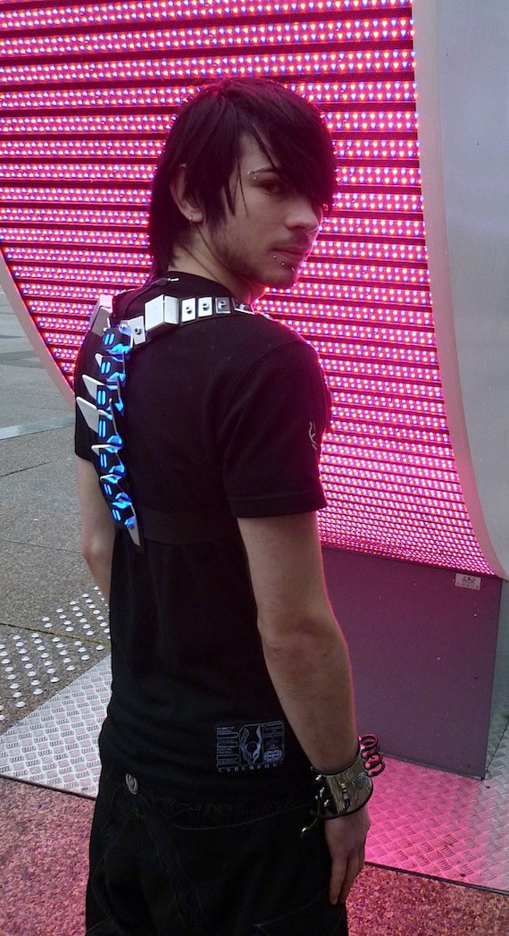 Constructed from durable aluminum plating with snap-on buckle adjustable leather straps and integrated LEDs. Takes 4 "N" batteries (included). Lights will stay on for about 3-5 hours. N batteries are fairly common and are usually around $2 a pair if you find a good place to buy them. Contact us if you would like some extra batteries included with your order. Extra vertebrae are available by request to lengthen the spine for $40 each extra segment, contact us for this option. Spine has a poseable metal backing so you can bend it to match the curvature of your back.