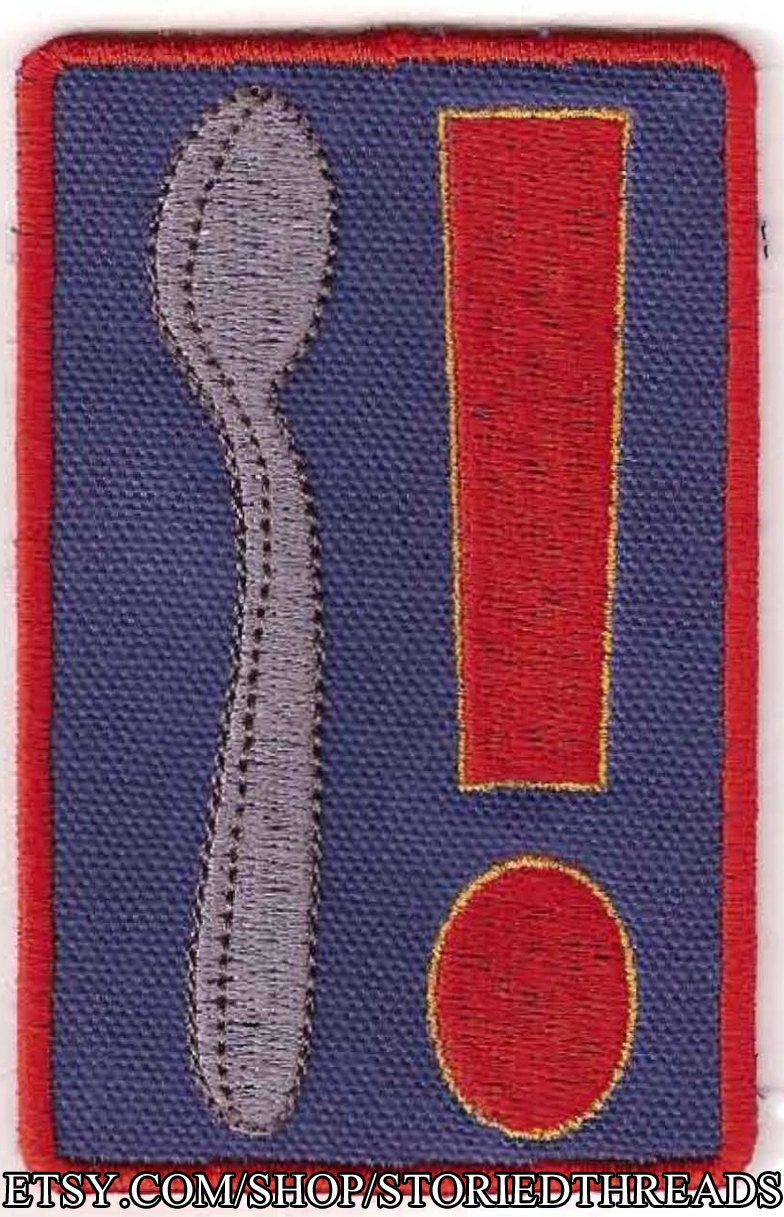 The spoon is stitched here in grey, followed by a red and yellow exclamation point for emphasis, on blue cotton canvas. This sew-on patch measures approximately 4" tall by 2.5" wide.